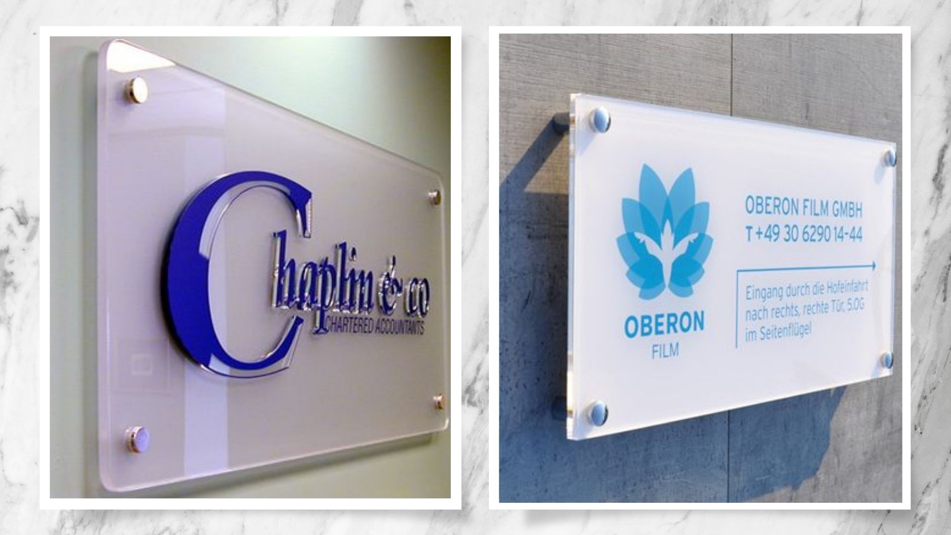 Bảng tên công ty từ mica thường được sử dụng thay thế cho các bảng hiệu làm từ thủy tinh do có tính chất tương tự nhưng lại bền hơn. Giá thành của mica cũng khá phải chăng. Chất liệu này có thể được uốn cong, ép và lắp ráp một cách dễ dàng.