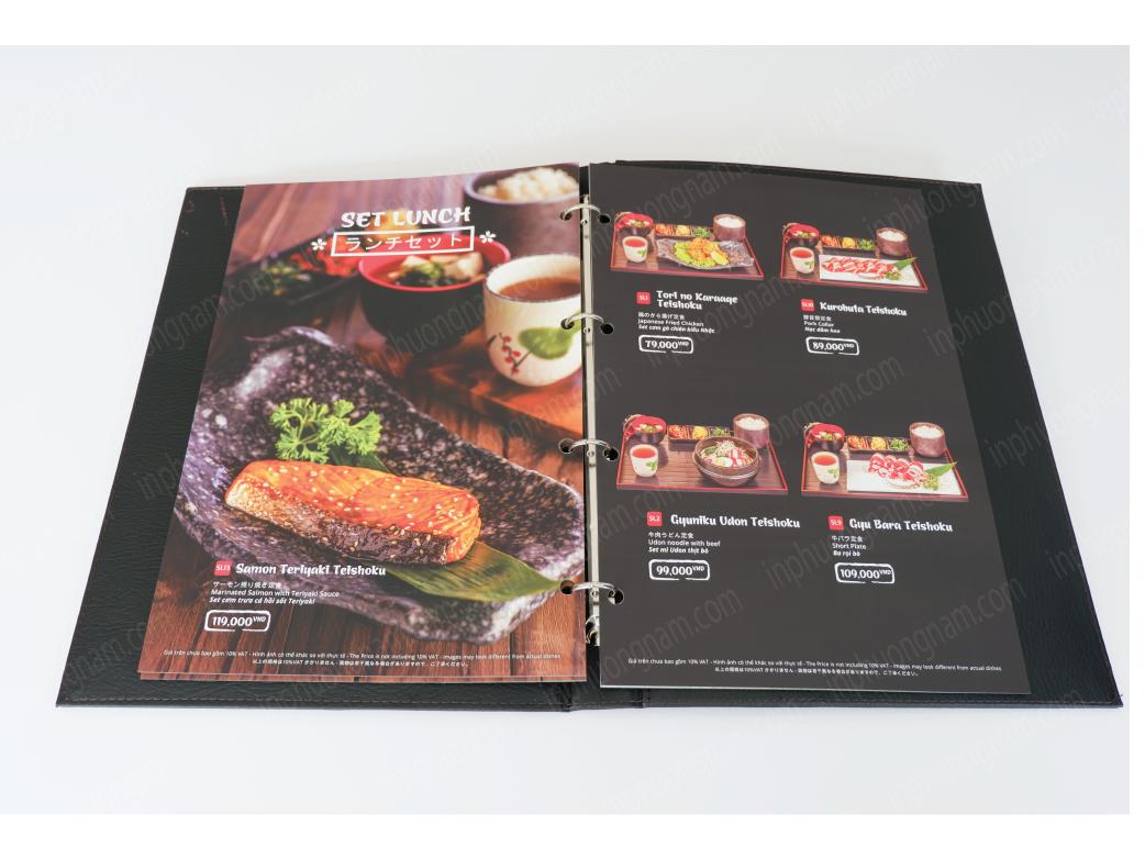 Ruột menu được in trên giấy c300, cán bóng, hoặc mờ, rồi sử dụng tép nhựa đựng vào, hoặc không,…cũng tùy theo yêu cầu của quý khách để có những cách hoàn thiện khác nhau.. Và số trang menu cũng vậy, cũng tùy theo mô hình kinh doanh của bạn để quyết định số trang số tờ trong đó.