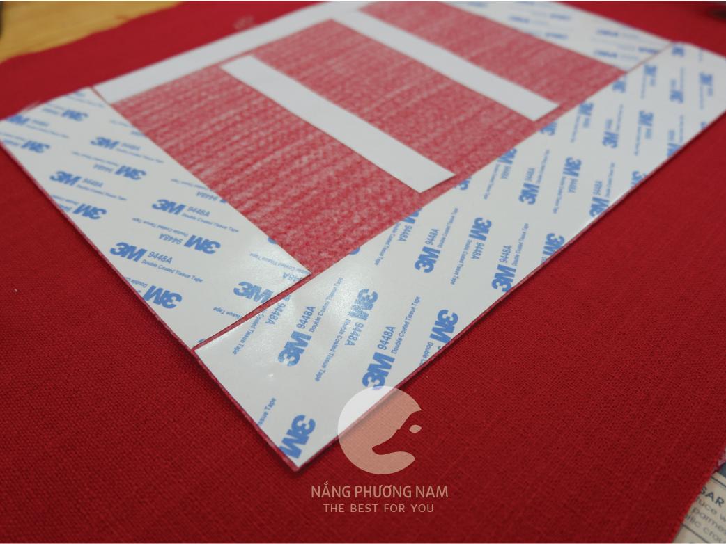 Vải sau khi cắt, sẽ được kiểm tra lại, rồi tiến hành dán keo, loại keo nhà Nắng dùng là keo 3M, nên đảm bảo độ dính cực tốt. Tránh trường hợp khi làm menu vải hoàn chỉnh sẽ khiến menu bị bung góc, bai xù, hư đường cắt.