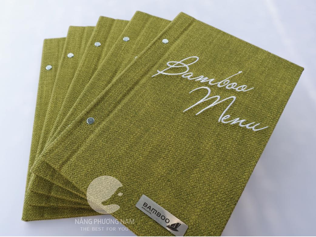Thêu logo vừa đẹp, vừa lạ, lại khá đặc biệt, tạo nên nét riêng của menu vải, hoặc bạn không muốn thêu thì có thể chọn phương án là dùng logo inox ăn mòn, đơn giản nhưng rất hợp với menu vải.