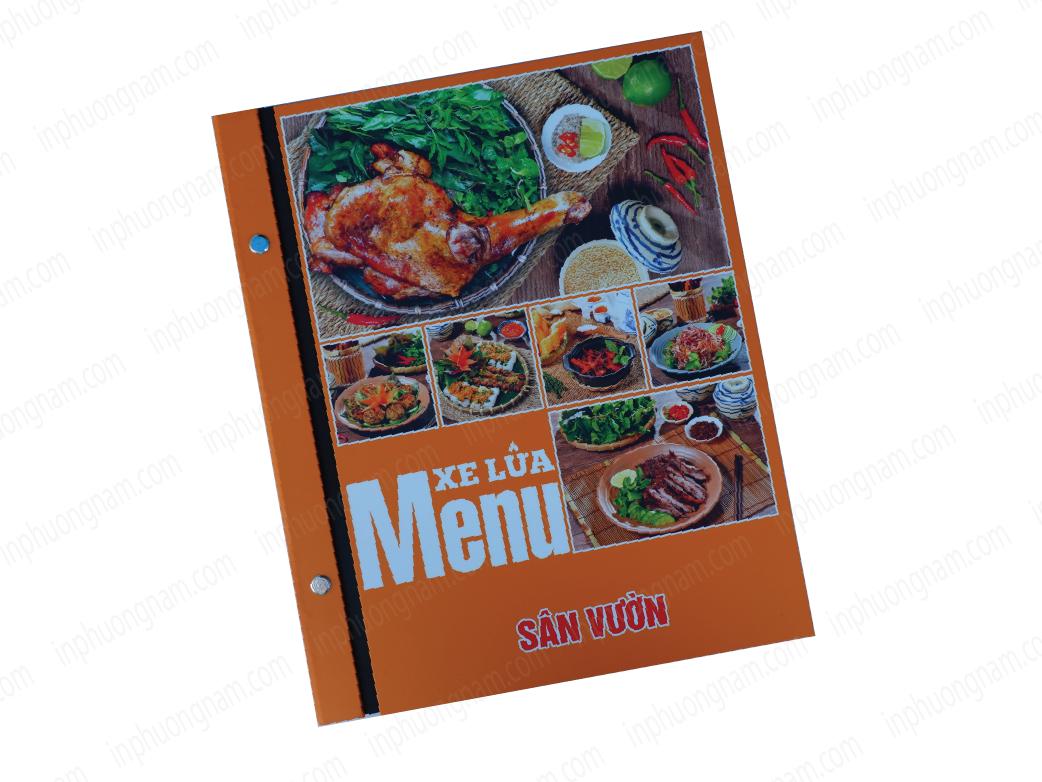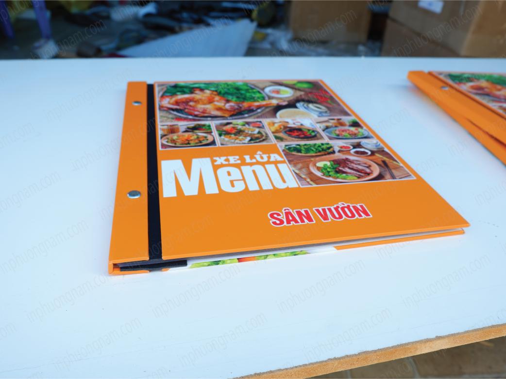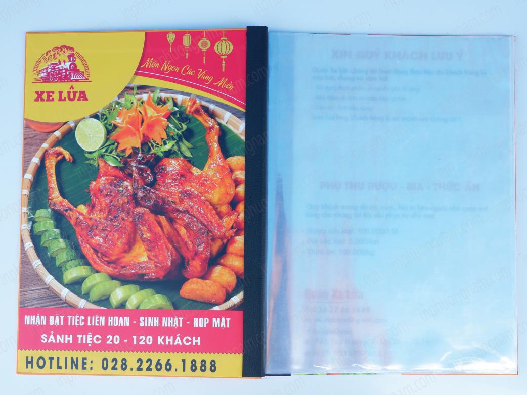 Mẫu menu bìa bồi gỗ cứng mới hoàn thành: menu bồi nhà hàng Xe Lửa với các thành phần và công đoạn chính như sau: