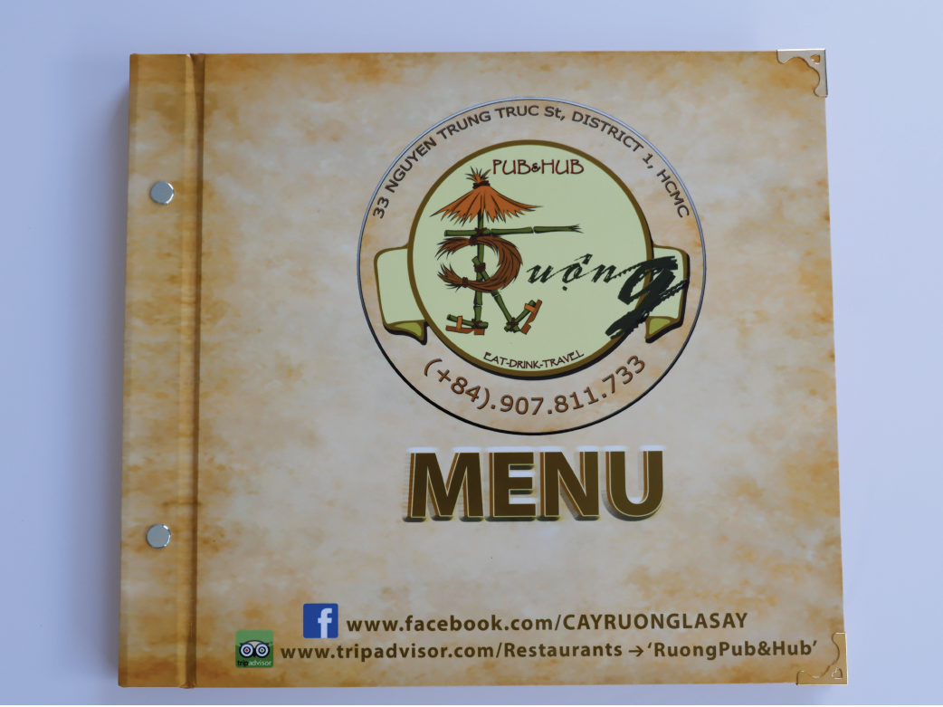 Cũng vì thế, chủ nhà hàng đã lên ý tưởng và sử dụng quyển menu bìa bồi gỗ mang đậm nét quê hương này, nhằm mang lại cảm giác gần gũi và thoải mái hơn khi đến đây. Và đây cũng có thể được xem là một ý tưởng, một chủ đề khá tuyệt vời.