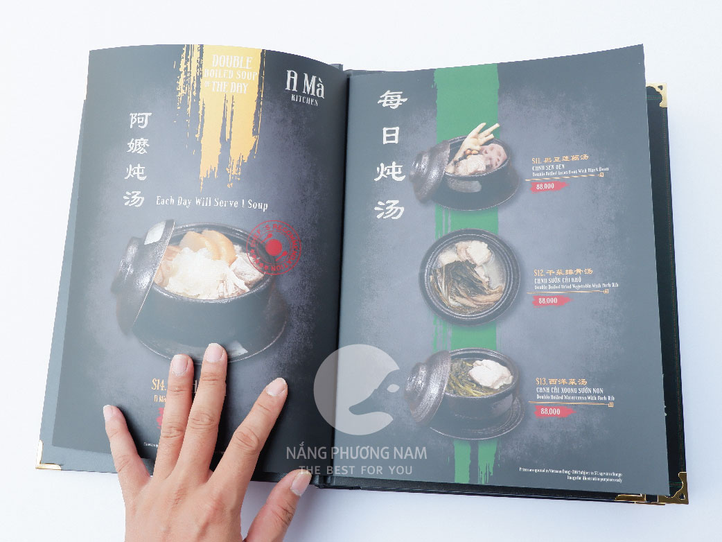 Menu bìa bồi gỗ A Mà Kitchen mà nhà Nắng làm về quy trình, chất liệu cũng không có gì thay đổi so với một số loại sản phẩm bồi gỗ khác, chỉ là Ruột của menu bìa bồi gỗ có hai loại :đó là in giấy cán màng,loại này thì rẻ hơn nhưng dễ rách hơn ,độ bền không lâu.Còn ruột nhựa thì khá bền nhưng giá thành lại hơi cao so với ruột giấy cán màng. Vì vậy, nhà Nắng sẽ làm theo yêu cầu của khách hàng ạ.