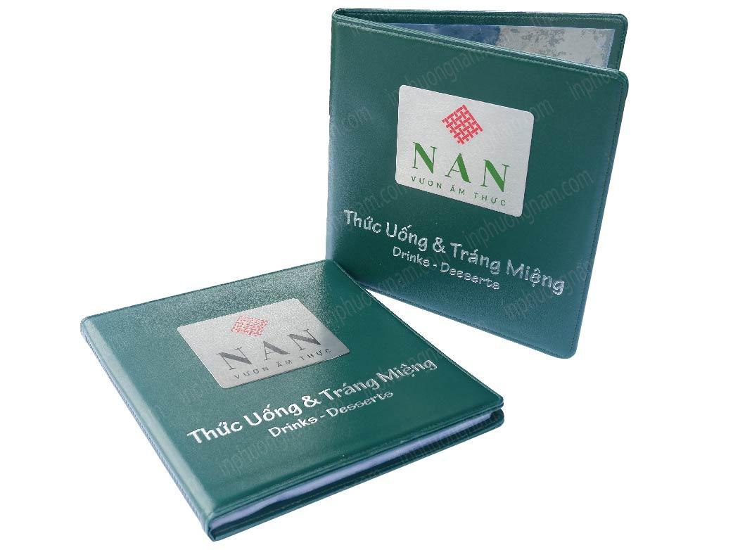 Công đoạn tạo thành : Bắt đầu là bồi bìa sau đó may ép lại, phải làm khuôn để ép tép nhựa riêng( vì mỗi một mẫu menu nhà hàng sẽ có những kịch thước khác nhau). Cuối cùng cả bìa và tép nhựa đựng ruột menu cũng được ép nhiệt lại với nhau để tạo nên quyển menu bìa da cao cấp màu xanh hoàn hảo như bạn đã thấy.