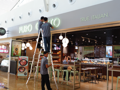 Quá trình thi công lắp đặt gia cố lại logo, chữ nổi bảng hiệu tại các quầy hàng ở đây kéo dài trong vòng 1 tuần lễ. Trong suốt qúa trình làm, chúng tôi có những hôm phải tranh thủ làm tới tận khuya, bởi vì ban ngày lượng khách đến sân bay khá đông, nên việc thi công có thể gây ảnh hưởng đến khách. Cho nên, để khách tại sân bay cảm thấy thuận tiện nhất chúng tôi cố gắng thi công làm đến tận đêm.