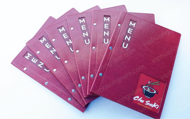 1.Menu bìa bồi cứng: với bìa là chất liệu giấy in, hoặc PP,…, sau khi in hoàn chỉnh sẽ được bồi lên một lớp ván gỗ, hoặc carton dày dặn, nhằm tạo phần bìa cứng cáp. Ngoài ra, còn có loại bìa giấy giả simili, nhìn rất lạ và đẹp.
