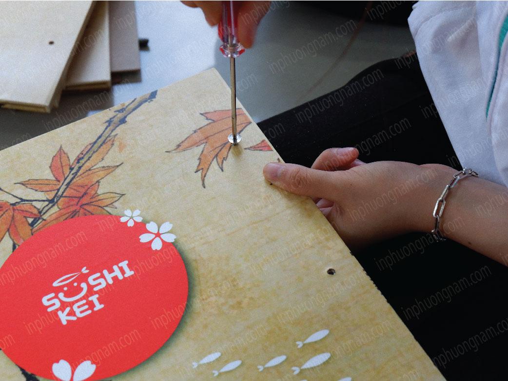 ✔Công đoạn thành phẩm: sau khi tất cả các phần của menu được làm hoàn tất, bìa và ruột sẽ được đi khoan, bắt vít thành phẩm theo yêu cầu=> tạo nên quyển menu bìa cứng hoàn chỉnh, đẹp như bạn thấy.