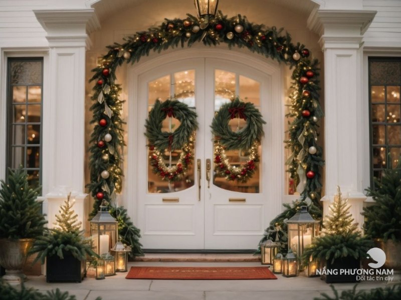 Vòng hoa và các phụ kiện giáng sinh nhỏ khác cũng đóng vai trò quan trọng trong việc hoàn thiện không gian trang trí ngoài trời. Treo vòng hoa vào cửa chính, kèm theo đèn Led nhỏ để tạo nên một cổng chào ấm áp. Ngoài ra, các phụ kiện như nơ, bong bóng, cành thông nhỏ cũng là những điểm nhấn tinh tế giúp làm phong phú thêm cho trang trí tổng thể.