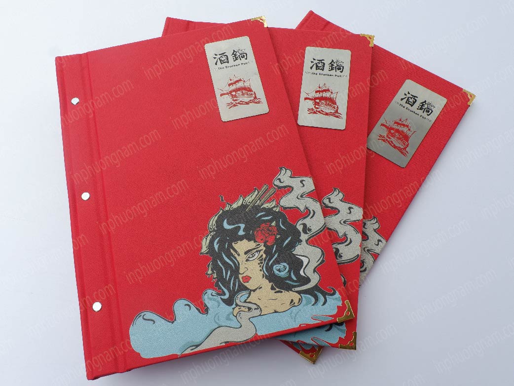 Mẫu menu bìa da cao cấp màu đỏ: cho nhà hàng The Drunken Pot: ( một màu mang đầy nhiệt huyết và năng lượng dồi dào và quyền lực mạnh mẽ)