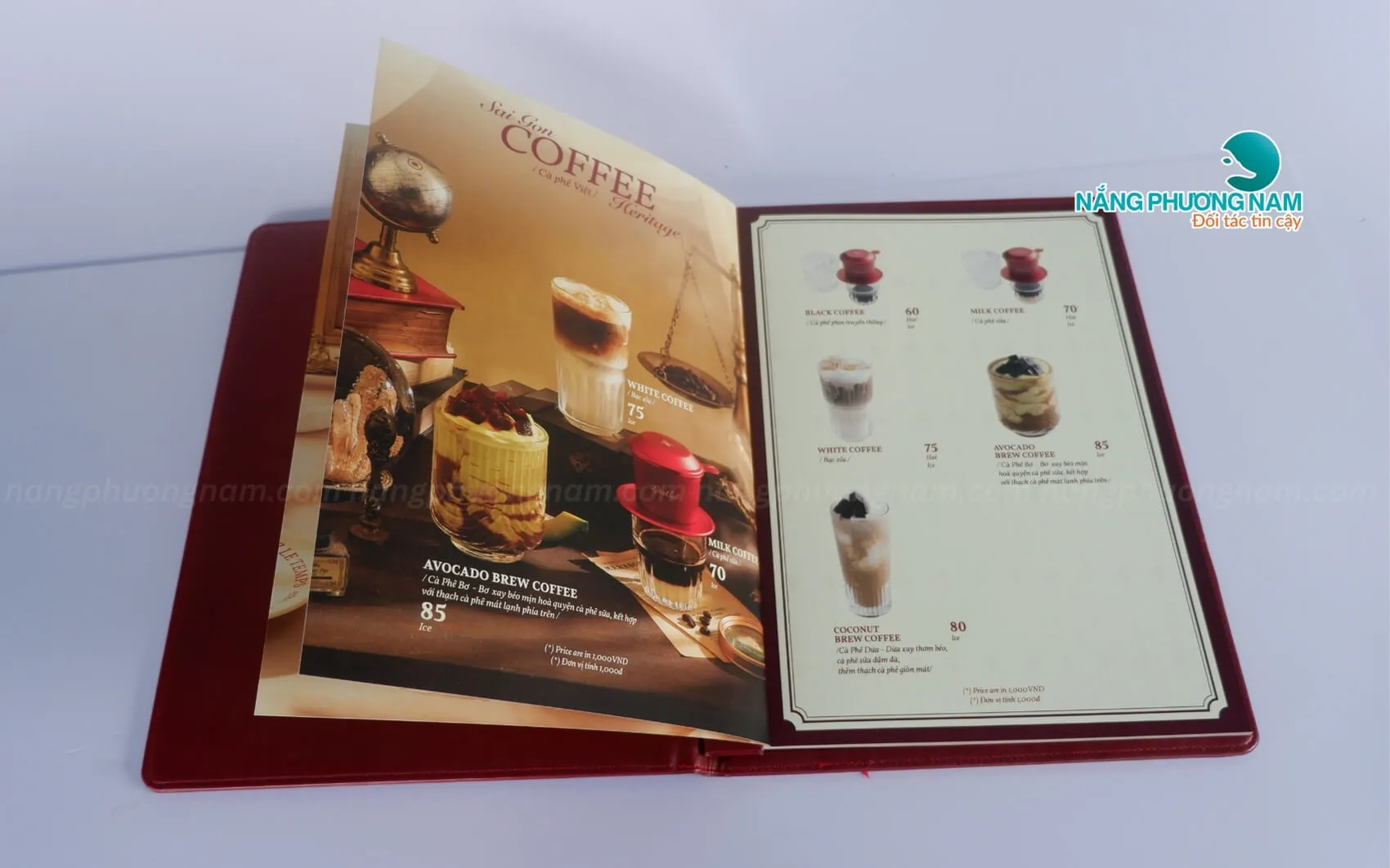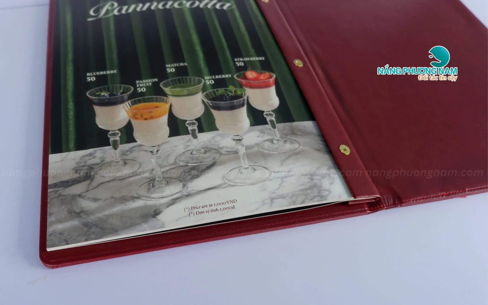 - In ấn menu chất lượng cao: màu sắc chuẩn, bìa da bền đẹp, logo ép kim tinh xảo.