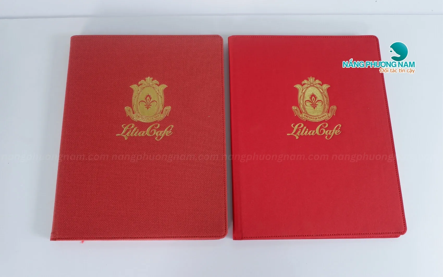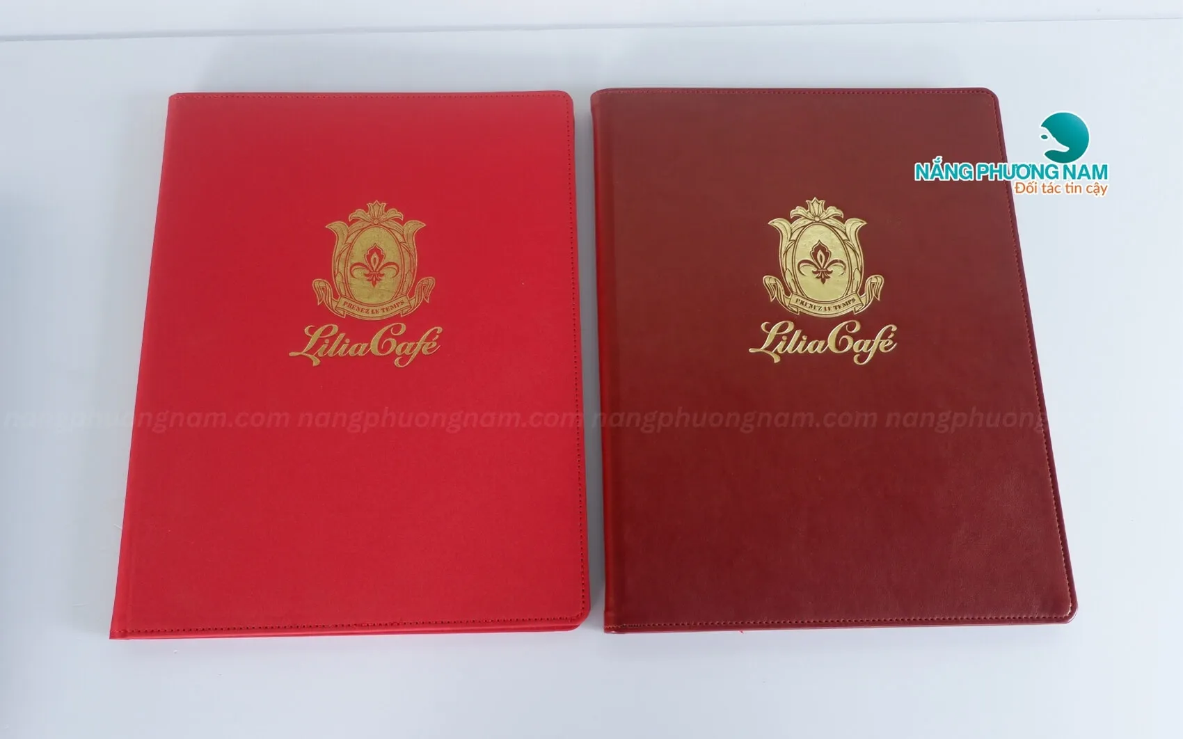 Chất liệu da PU cao cấp không chỉ đẹp mắt mà còn dễ dàng vệ sinh, giúp menu luôn giữ được mới. Điểm nhấn không thể bỏ qua chính là logo ép kim ánh vàng. Khi ánh sáng chiếu lên, từng đường nét logo lấp lánh, nổi bật trên nền đỏ, tạo nên sự sang trọng và đẳng cấp.