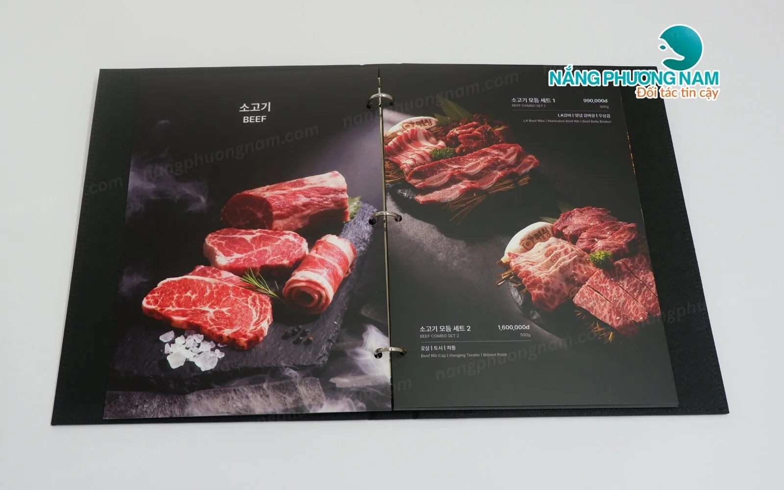 Bên cạnh đó, do đặc thù món nướng và lẩu sinh ra nhiều dầu mỡ, hơi nước, chất liệu menu cần đủ bền để lau chùi thường xuyên mà không bong tróc hay xuống màu. Đây là yếu tố rất quan trọng để menu có thể sử dụng lâu dài.