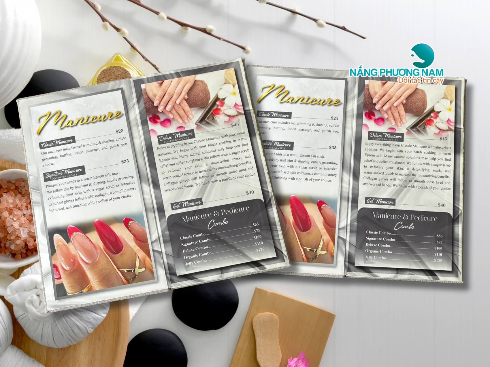 Trong ngành làm đẹp, trải nghiệm của khách hàng không chỉ đến từ dịch vụ, tay nghề hay không gian – mà còn đến từ những chi tiết nhỏ như cuốn menu. Một menu spa sang trọng, menu nail rõ ràng và đồng bộ với phong cách tiệm sẽ giúp khách hàng cảm thấy tin tưởng và dễ dàng chọn lựa dịch vụ phù hợp.