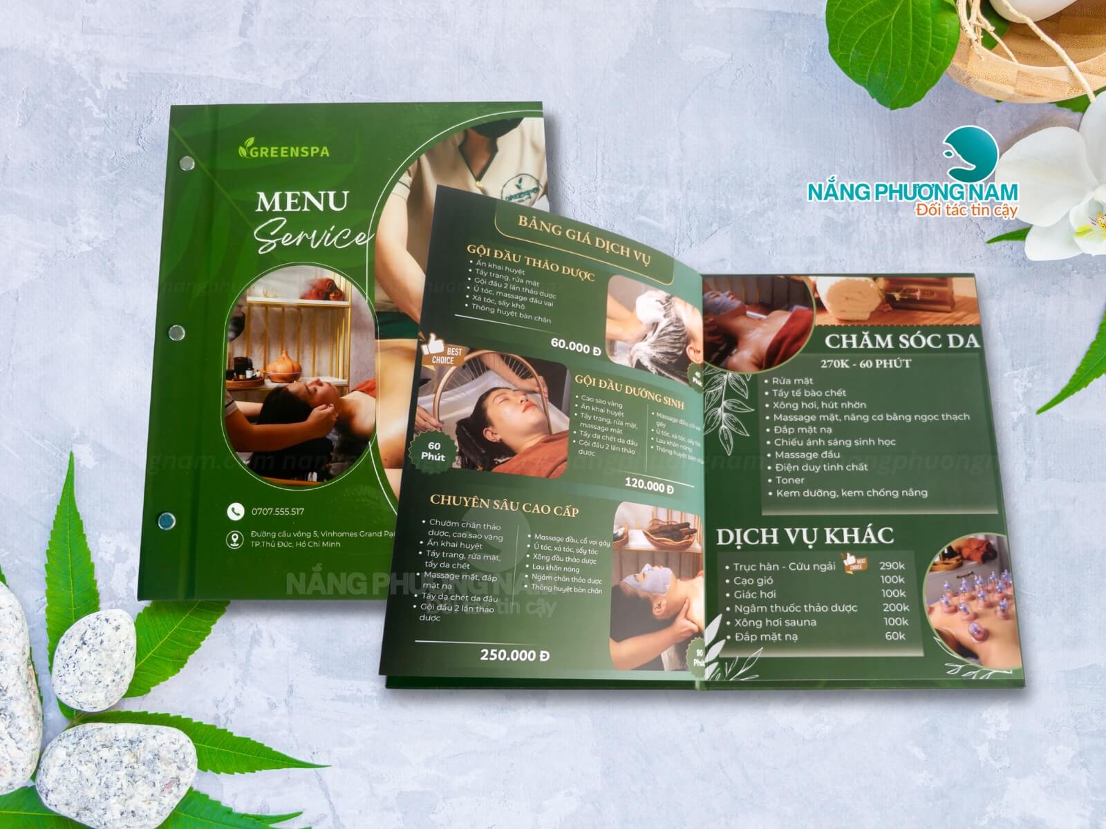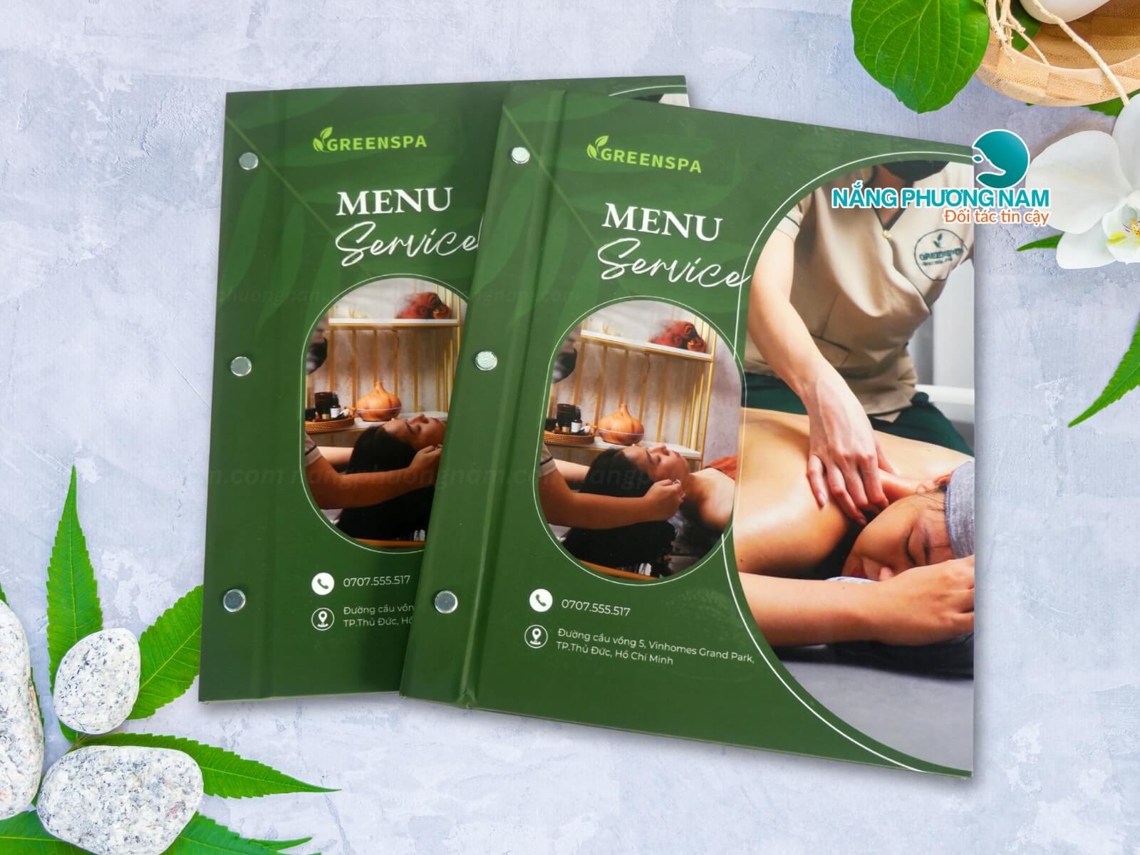 Nắng Phương Nam giới thiệu mẫu quyển menu dành cho Green Spa – nhẹ nhàng, đúng chất ngành làm đẹp.