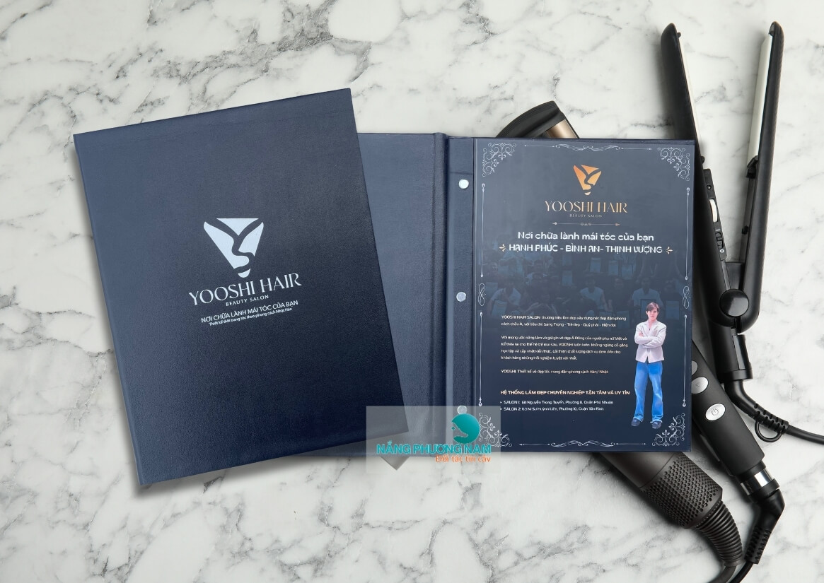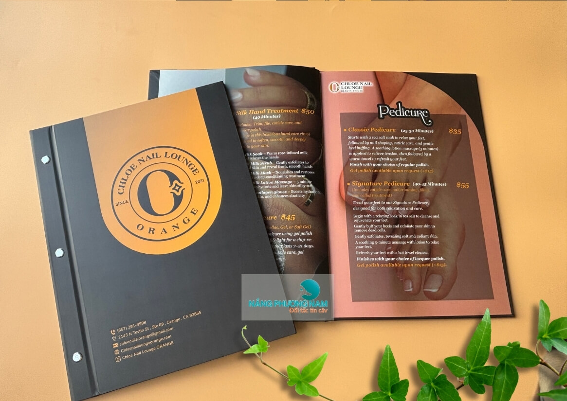 Menu dạng cuốn thường được sử dụng nhiều trong các spa, tiệm nail, salon tóc… bởi thiết kế gọn gàng, dễ cầm, dễ lật, và đặc biệt nhìn rất chuyên nghiệp.